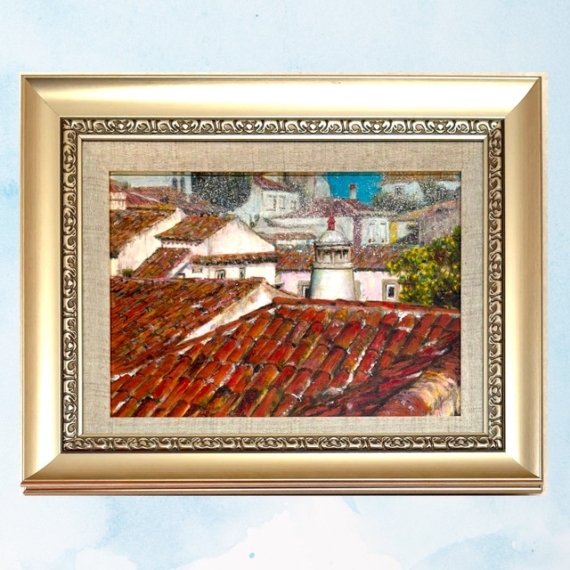 「作品のモティーフと特徴」 作品「南仏の港町にて」は、地中海沿岸の街・カシの様子を描いた作品です。 地中海沿岸には魅力的な街がたくさんありますが、ここは私が最も好きな場所です。 ここは、カランクと呼ばれる石灰岩の絶壁で有名です。 確かにカランクも見事ですが、私が惹かれたのはここの街並み。 それは南仏にありがちな、豪華なヨットが並ぶ港町でなく、庶民的だけど美しい町であったからです。 この絵のように、ゆったりと街歩きを楽しめるような街並みだったのです。 そんな、心からの感動を持って作品を制作しました。 額入りでお届けしますので、そのまま壁に飾ることができます。 リビングや寝室など、お部屋のインテリアとして、ご自宅用に、また新築祝いなどのプレゼントとしてご利用ください。 [商品説明] - 画家・福家佳則(Yoshinori Fuke) 2025年制作 - 写真の額縁をつけてお届けします(アクリル面版) - 額縁サイズ 44.5x37.3x5.0cm - キャンバスサイズ F4 33.3x24.2x2.0cm [技法]油彩画 木製のパネルにミューグラウンドで下塗りしています 下塗りに綿布を挟んで下地を補強しています その上に油彩で描いていますが、卵を使ったテンペラホワイトとの混合技法で描いています その分、柔らかいイメージに仕上げています また、発色の良い特殊な絵の具を使っているので、鮮やかに感じてもらえるはずです 部分的にアルミ箔を散らして、南仏の強い日差しを表現しました。 ※作品は直射日光や湿気を避け、清潔に保管してください。 [作家・福家佳則] 個展やグループ展で活動している画家です。 花と街の風景画を描いています。 絵を初めて、すでに15年ほどになります。 2024年の個展では10数作品をお求めいただきました。 お部屋に飾ってもらうことが、何よりもの喜びです。 詳しくはホームページをご覧ください。 https://fukutoraku.com 今後とも、よろしくお願いします。 ※変色には十分に気を遣って制作しておりますが、万一、異常があった場合にはお気軽にお問い合わせください。真摯に対応させていただきます。