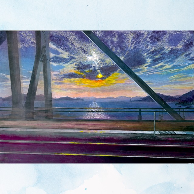 [作品のモティーフと特徴] 作品「走る窓辺にて」は、瀬戸大橋から眺めた夕暮れの風景を描いたアクリル画です。 岡山から高松に向かう電車・マリンライナー車中で見かけた光景をモティーフにしています。 私は香川県在住ですが、そんな私でも瀬戸の風景はいつも格別です。 まだ、橋がなかった時代には連絡船で1時間程かけて渡っていました。船上で風に吹かれながら美しい風景を眺めていると感傷的になったものです。 現在は、電車でほんの15分ほどの旅です。それでも四季折々、また時間帯によって、さまざまな景色を楽しむことができます。 この作品は、B3サイズのベニアパネルに水彩紙を水張りし、アクリル絵の具で描いています。 水面にはアルミ箔を粉にして散らし、海面の柔らかな反射を表現しました。 額には入っていませんが、その分軽いのでピンなどで壁にかけることができます。気軽にお好きな場所に飾って楽しんでください。 この作品によって、お部屋に穏やかなひと時が訪れることを心より願っています。 ご自宅用に、また新築祝いなどのプレゼントとしてご利用ください。 [商品説明] 画家・福家佳則(Yoshinori Fuke) 2021年制作 アクリル画 パネルサイズ B3 36.4x51.5x2.3cm ※直射日光の当たる場所や湿気の多い場所での保管、掲示を避けてください。 [作家・福家佳則] 個展やグループ展で活動している画家です。 花と街の風景画を描いています。 絵を初めて、すでに15年ほどになります。 2024年の個展では10数作品をお求めいただきました。 お部屋に飾ってもらうことが、何よりもの喜びです。 詳しくはホームページをご覧ください。 https://fukutoraku.com 今後とも、よろしくお願いします。