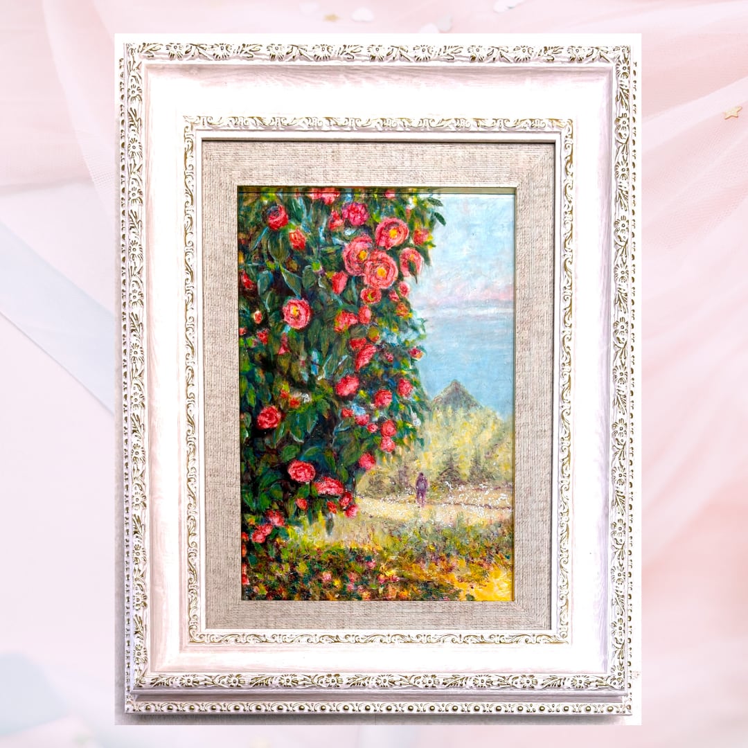 風景画「山に咲く赤椿」油彩画 SM/額付き