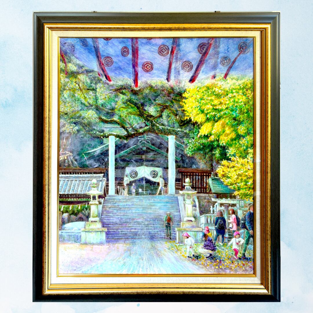風景画「境内で憩う・艮神社」油彩画 F20 額縁付き