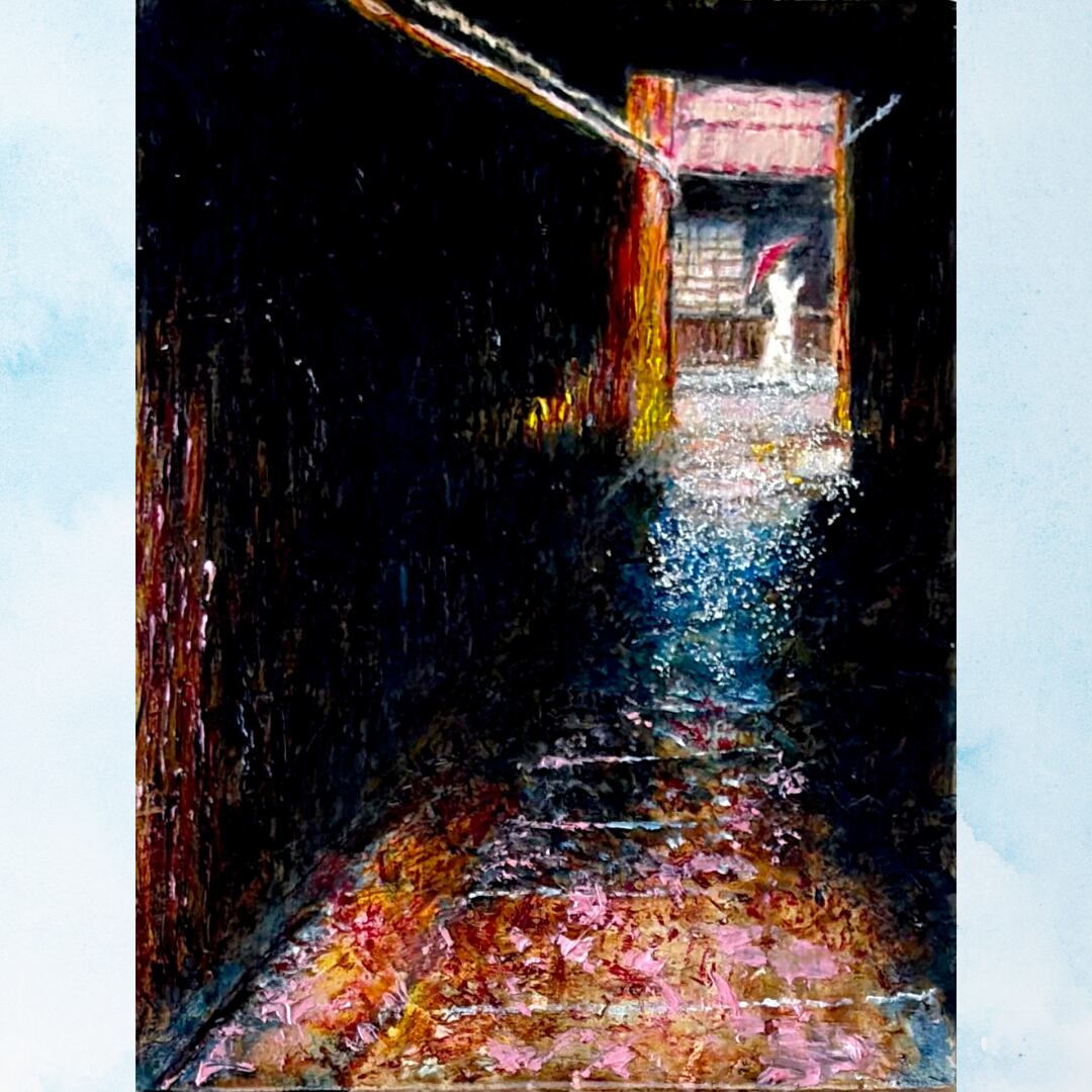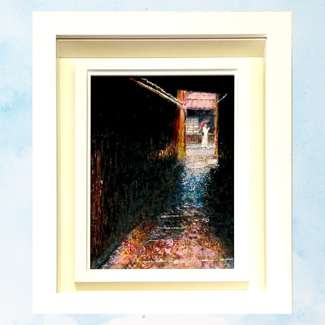 これは、京都の石塀小路で見かけた光景をモティーフにして描いた作品です。