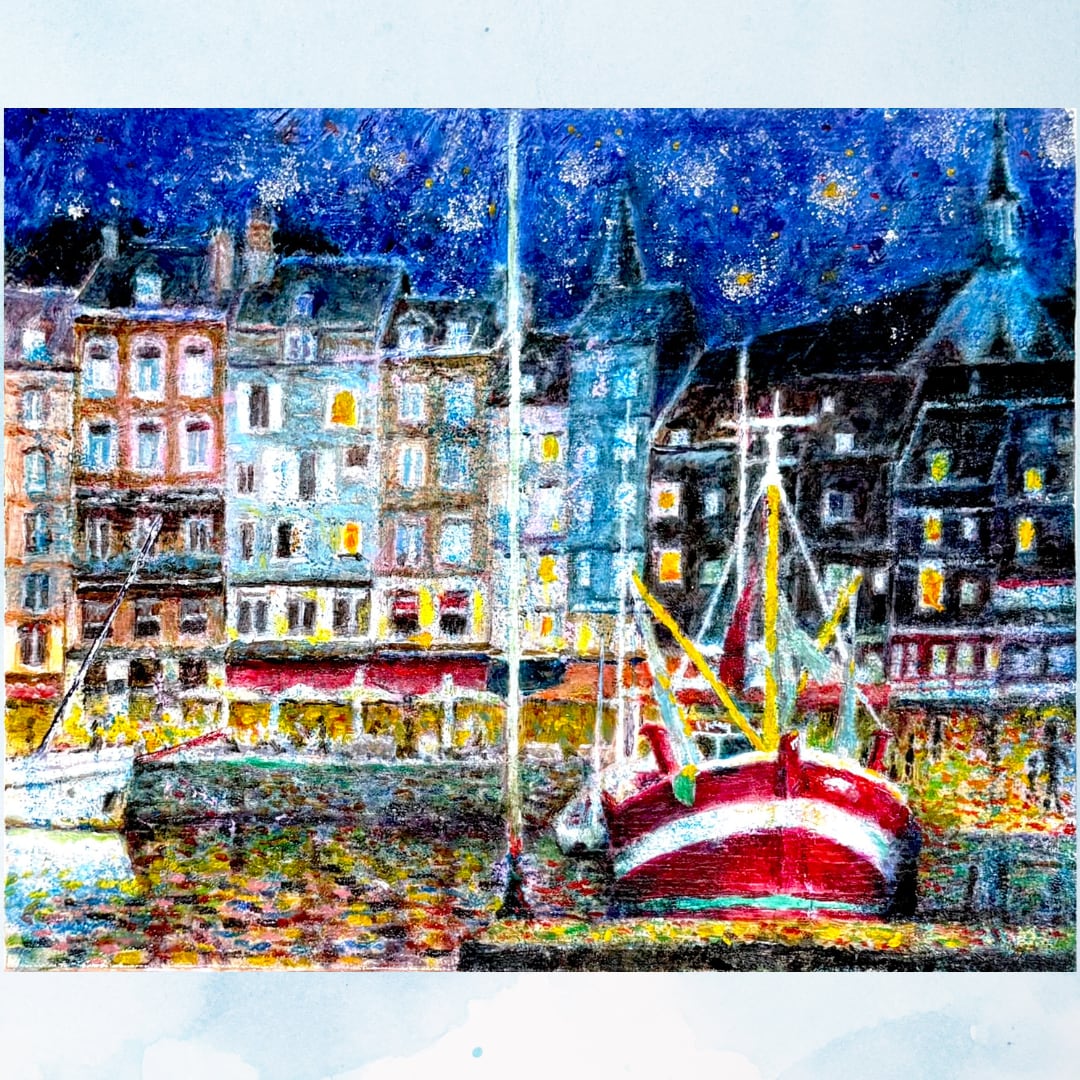 作品「オンフルール・星降る港町」は、フランスの海辺、ノルマンディー地方にある港町の光景をモティーフにした作品です。