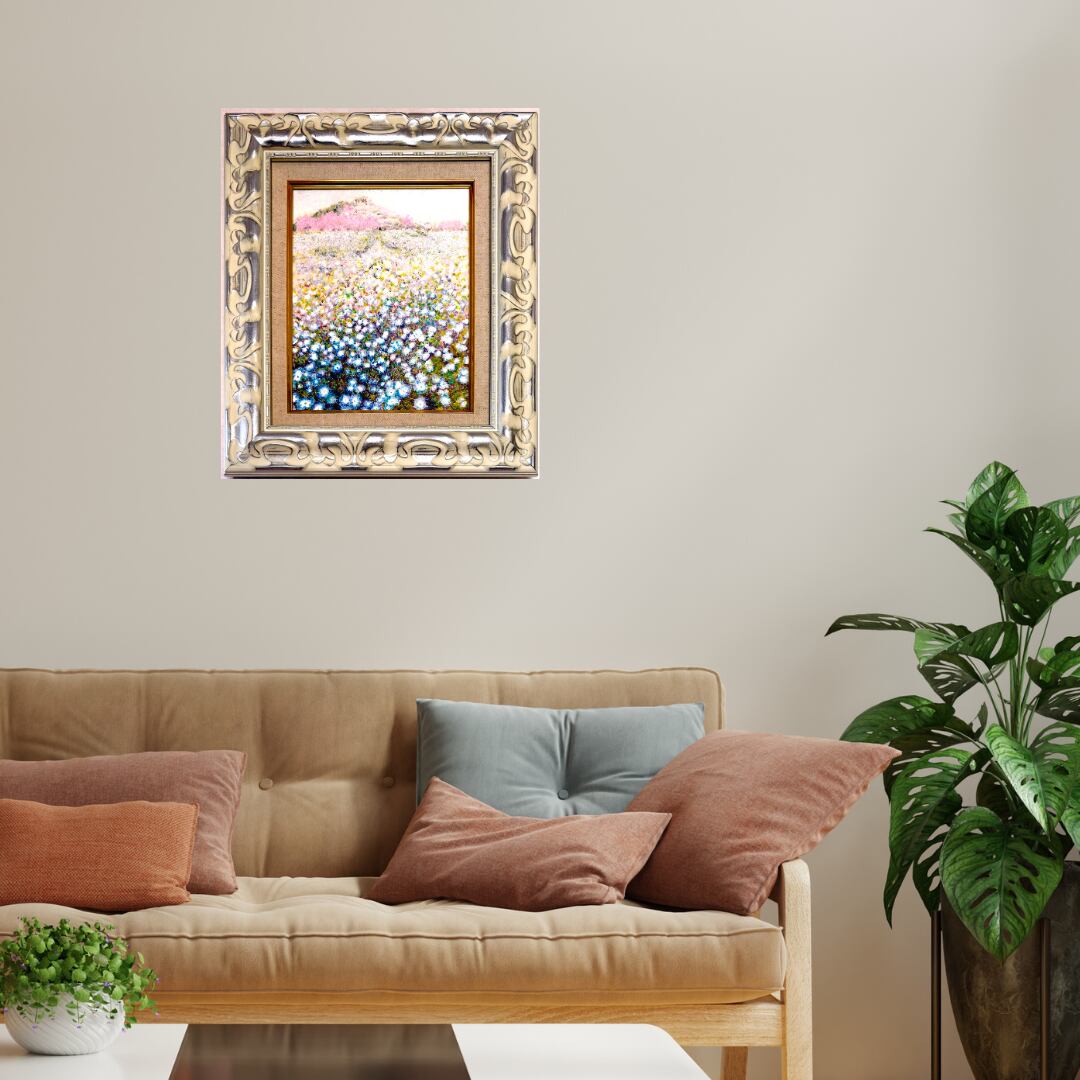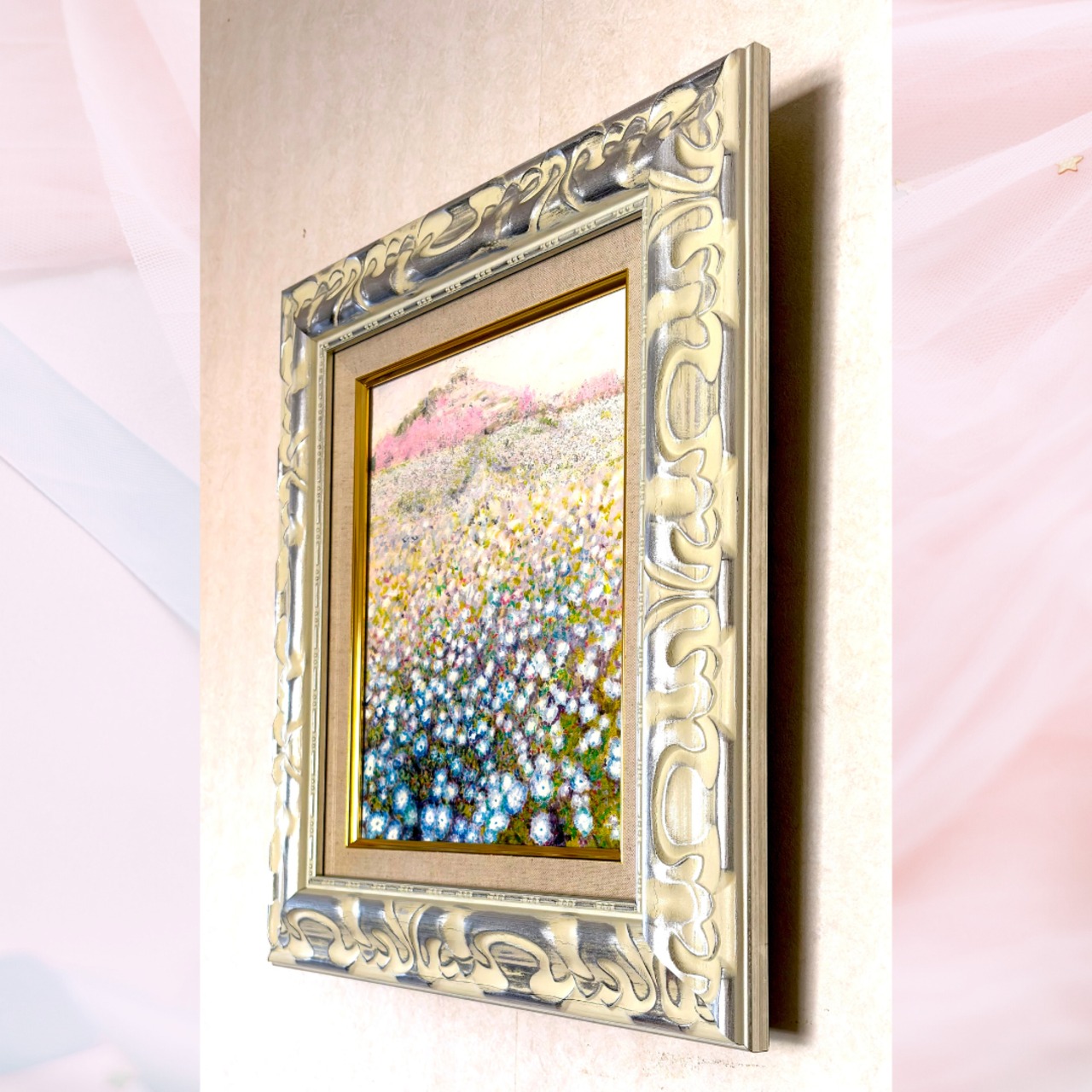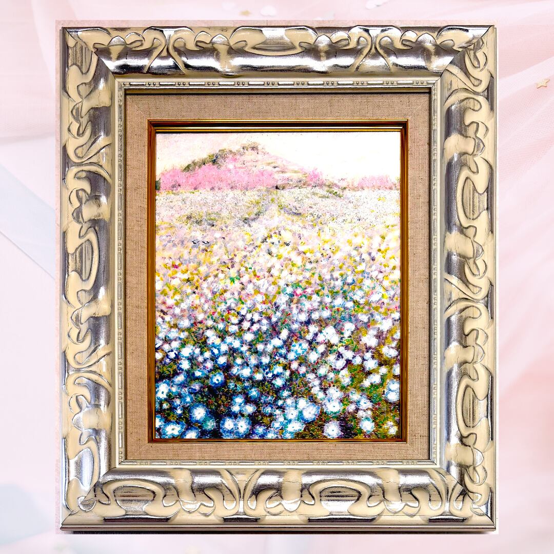 風景画「島の丘を彩るネモフィラ」油彩画F3/額付き