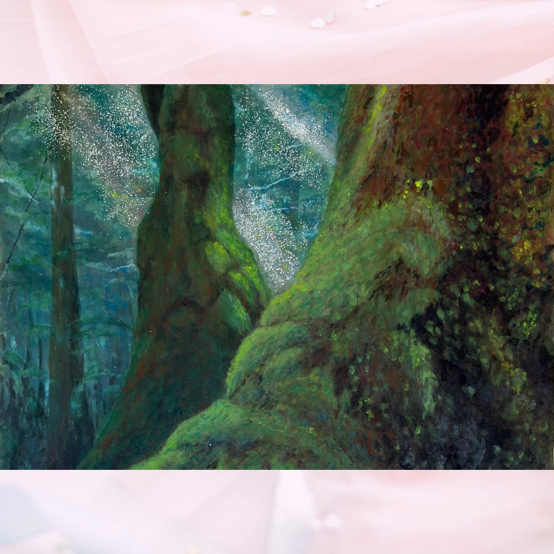 作品「屋久杉の森」は、その名の通り屋久島に自生する屋久杉の光景を描いたアクリル画です。