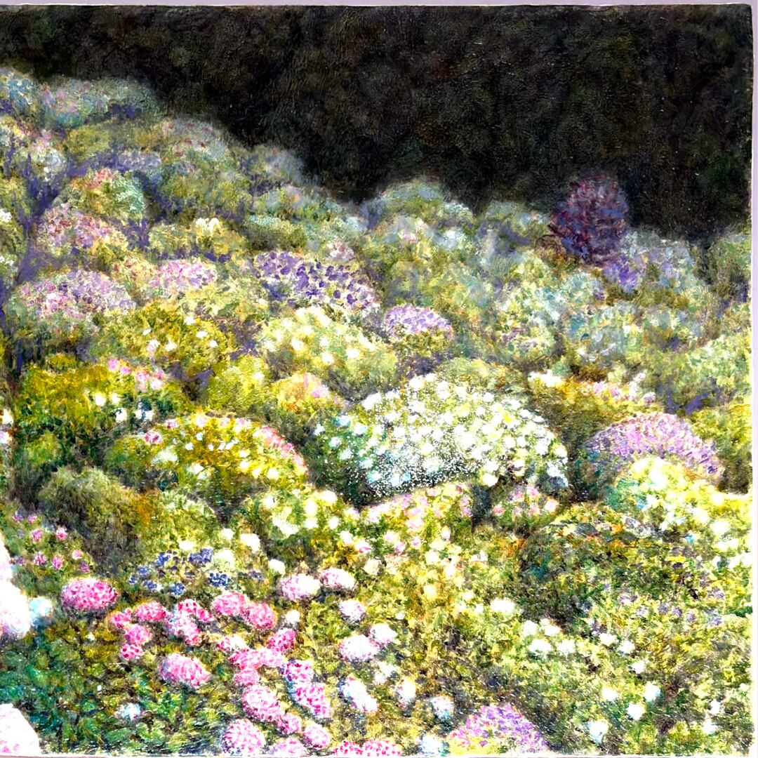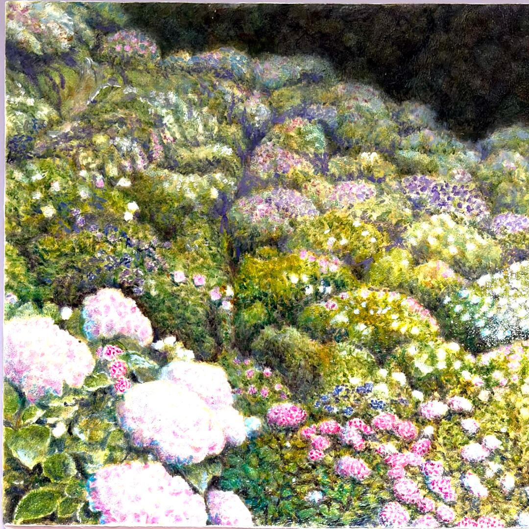 作品「光あふれる新宮あじさいの里」油彩画・B3は、険しい峡谷に広がる可憐なアジサイの花を描いた作品です。
